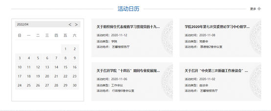 日历日期链接学院所有活动,以直观的表现形式介绍活动时间及情况。同时采用时间轴的形式回顾活动,可以让访问者快速便捷的访问以往相关活动信息。