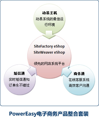 | 动易电子商务产品整合方案由四大产品组成,分别是:动易电子商务软件系统、动易短信通、动易主机、网站商务通。他们构成了动易电子商务产品整合方案的有机整体。 1、动易eShop电子商务软件:是整个方案的核心,强大的企业级系统功能平台能支持各类B2C业务运营。 2、动易主机:作为动易软件的最佳运行伙伴,能提供给客户IT业务最优的运行平台环境支持。 3、动易短信通:与动易软件无缝衔接,在动易软件中内置强大的短信通功能,包括有:订单手机通知商家、已收款通知,顾客发货通知等,更可发送最新商品资讯、促销打折信息给网店会员,还可进行会员节日生日问候。 4、网站商务通:在线客服软件。是一个极为强大的网店商家与网店顾客的在线沟通工具。通过商务通,商家可以与网店访客进行主动沟通销售,提供更加时效的销售咨询服务。 |