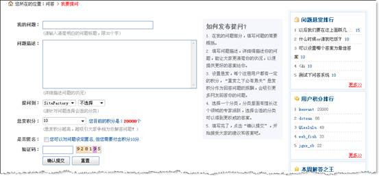提问页面与国内知名的百度知道、新浪爱问相似,均支持标题、内容描述、分类选择、积分悬赏、匿名设定、以及验证码等各项主要内容。目前不提供上传图片的问题支持,这是因为如果开放传图就会涉及安全、页面样式破坏等问题,而目前一般的问答如百度等都没有对图片进行支持。