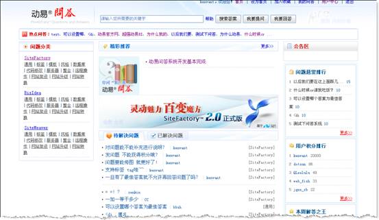 通过上图我们可以发现,目前动易问答系统功能已经基本完整了。从最顶部的“会员登录”、“我的问答”到“我要提问”、“我要回答”等功能均已完成;同时也已经完成了“问题两级分类”、“待解决问题”与“已解决问题”区分,“用户积分排名”、“本周解答之王”、“问题悬赏排名”等我们常见的问答功能模块。一句话,这个预览版已经颇具规模!