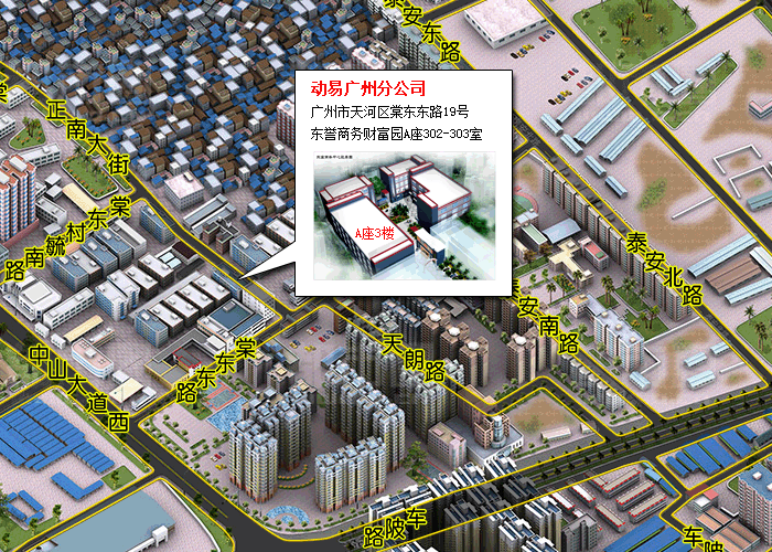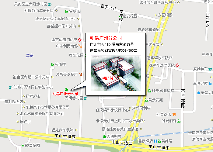 动易广州分公司新址位于位于广州天河区棠东东路的“东誉商务财富园”,办公面积近500平方。棠东东路与黄埔大道与中山大道相连,周围有棠东、棠下、东圃等居民区和骏景花园、天朗明居、春江花园等小区。有296路、515路、210路、883路等数十条公交经过,2009年底前将开通的地铁五号线在附近设有车陂站地铁口,交通与生活十分便利。