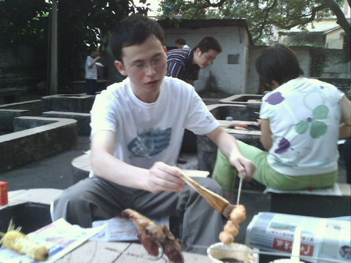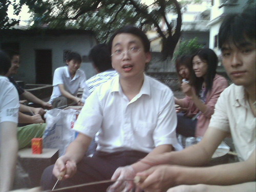看到我们的技术实力如此差劲,粟总扬言要烤出鸡腿的典范,振奋起动易的雄风。只见他脚步稳健、动作娴熟、手持叉子上下翻飞,一招一式有版有眼,转眼间就飘出烤肉的香味,还传来“兹兹”的冒油声,颇具风范。终于等到战果出来,众人一瞧,嘿!排骨烧得还真不赖,油光亮滑的,果然高手;但鸡腿就……在色泽及其它标准衡量下,最终还是普通了点,未能通过典范认证这关,不过总体说算挺好的啦。