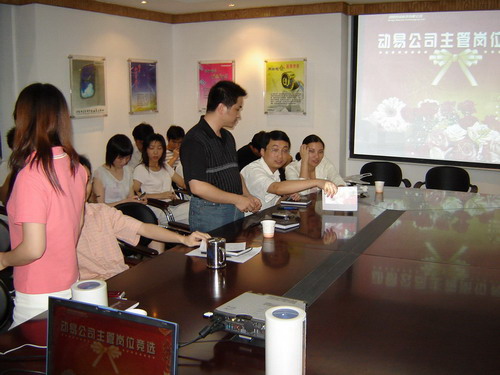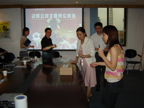在经过人力资源部在4月份的紧张筹备后,5月13日下午,动易公司主管竞选活动在动易会议室正式拉开了序幕。此次主管竞选活动分别设有四个管理职位,分别是开发部产品经理、设计部主管及主管助理和客服部主管助理。共有十一人参加竞选,选拔小组由公司管理层组成,全体员工参与评选,同时以现场公开投票、唱票的方式进行民主选举。