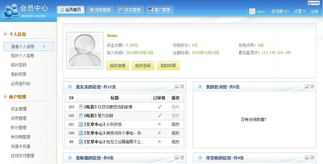 重构的会员中心使用全新的布局,左侧为个人信息区域、顶部为功能导航区、右侧为操作区域。会员中心跟主页一样均使用模块化、CSS化,方便设计师可以更好的对其控制。简单来说,模块化即页面的每部分都是独立互不影响,用户可以根据网站的要求对模块进行添加或删除;CSS化即去除了主题,将页面中控件的所有样式都提取出来,统一使用CSS控制,当会员中心风格需要改变的时候,只需要修改CSS文件即可达到牵一发动全身的效果。