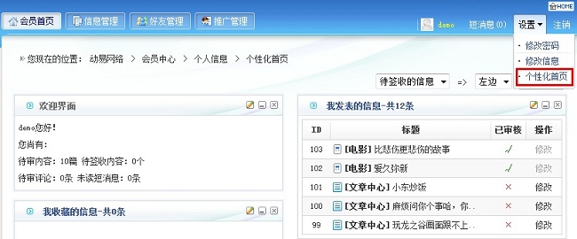 在“设置”里有一个“个性化首页”的选项,这里跟后台工作台的功能一样,您可以随意添加或者删除需要的模块,每个模块还可以自由拖动(会员中心首页也可以),设置完毕后在会员中心的首页亦会同步更新。