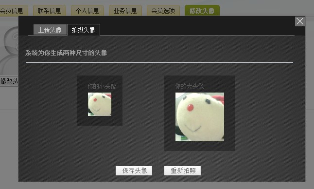 下面我们来看看有趣的头像应用,可以直接在会员中心首页点击头像进入修改页面,或者在左侧的“修改个人信息”来实现。更改头像有两种方式,您可以直接上传头像,或者使用在线拍摄头像功能。拍摄完毕后还会出现图片剪裁框,根据取景效果和拍摄质量,可以自由调整画面尺寸,使得头像更加“精神”、展示自己的独特风范。当然,如果感觉此次拍摄的质量一般,还可选择“重新拍照”。