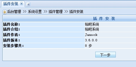 把插件包解压后整个目录上传到网站根目录 Plugins 目录下,如是在本地测试可直接放到本机根目录 Plugins文件夹内。接下来我们打开SiteFactory® 3.6的后台,依次点击系统设置——插件管理,我们就可以看到下面出现了“贴吧系统”的插件。然后按照系统的提示一步一步操作即可。