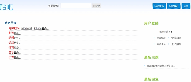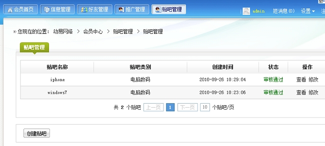 通过以上步骤,后台配置就完成了,我们在前台的会员中心看到增加了贴吧管理功能。下面我们来预览一下效果。