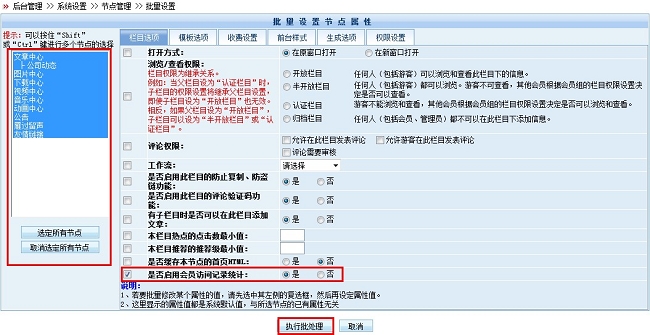 动易SiteFactory® 3.6要实现这个功能很简单,我们先开启会员访问纪录统计的功能。在系统设置——节点管理——批量设置里,选中需要的节点然后在右侧的区域中找到最下方的“是否启用访问纪录统计”,选择“是”,还有别忘记打上小钩,最后点击“执行批处理”即可。