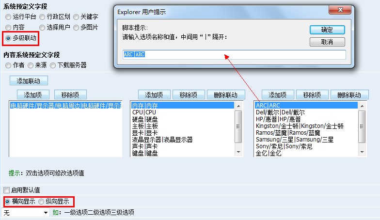 第二步,设置联动项。我们可以看到系统预定义字段里有“多级联动”,选中后即可以设置总类、一级类别、二级类别等等,理论上SiteFactory® 3.6的联动支持无限级扩展,不过最常用的是两至三级联动就够了。此外,多级联动还支持横向显示及纵向显示。