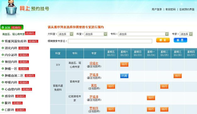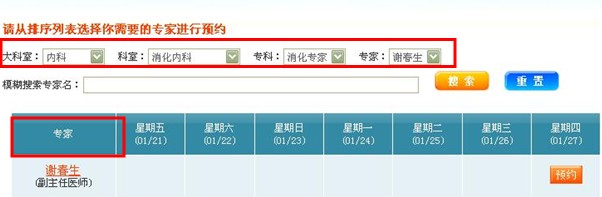 经过上一步的操作,我们现在已经进入预约页面了,大家可以在下面的截图中看到,页面呈现出了科室、专家的排班时间、是否可预约等信息,我们可以进行仔细的查看,根据页面提供的信息确定我们需要预约的专家情况。