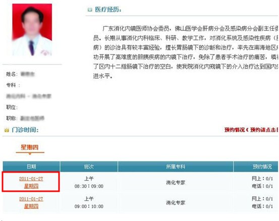 进入预约界面后,系统会自动显示出专家的医疗经历、门诊时间等信息供我们查看,只要点击下图红框中的预约日期后,根据下一步的提示进行简单操作,便完成了整个预约挂号的流程,接下来你要做的就是准时赴约进行诊疗了。