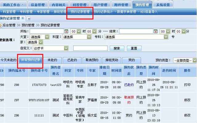 医院可对预约信息进行灵活处理,系统还提供对所有预约记录历史的按时间段查询,并可将查询记录导出至EXCEL的功能,以方便对预约记录的进一步分析和管理。
