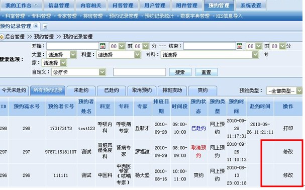 在开诊当天,医院医务人员可以根据实际门诊赴约的情况进行预约信息的修改,可以为准时赴约的患者打印出预约单并将信息改为“已赴约”,将未赴约的患者信息改为“爽约”……系统将可以协助医院对全部的预约信息进行有效的管理和归类。