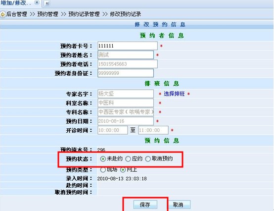 进入修改页面后可以看到系统会呈现出我们所需要的全面预约信息,我们只要将“预约状态”修改为相应状态,然后点击“保存”就可以了。