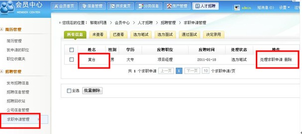 前台的应聘和招聘流程就为大家介绍到这里了,那么网站管理员在后台又是如何处理这些前台信息的呢?我们再来看一看吧!
