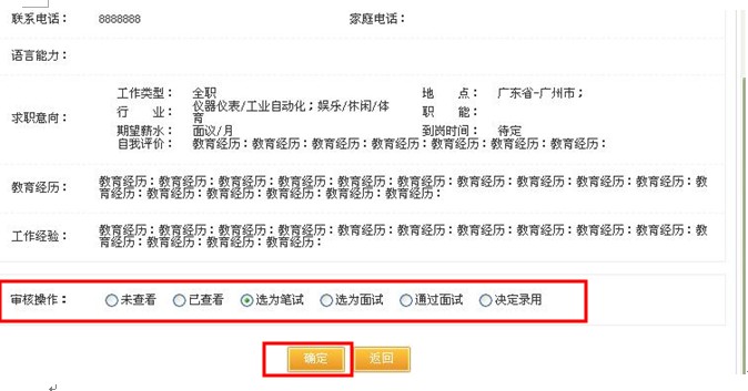 根据应聘者是否满足企业需要的情况,我们可以对求职信息进行相应的操作,比如:已查看,选为面试,面试通过等操作,非常方便的帮助我们对大量的应聘信息进行分类处理。