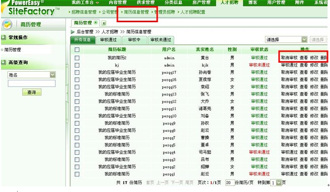 首先让我们进入网站后台的人才招聘版块,点击“简历信息管理”,前台的简历信息便一目了然了,我们看到在“操作”一栏中系统提供了多种信息处理操作选项,我们可以根据实际需求进行信息处理。如图: