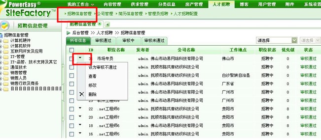 要想处理招聘信息,点击“招聘信息管理”就可以了,右击最左侧的小三角形,便出现了我们在图中看到的选项,我们可以根据需要进行相应的信息处理。