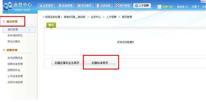 点击“简历管理”,就可看到系统为我们提供了两种简历模板——应届毕业生简历模板和标准简历,非常人性化的满足不同应聘者的实际需求。我们可以根据自己的情况选择简历模板,这里我们就以标准简历为例继续以下的流程。