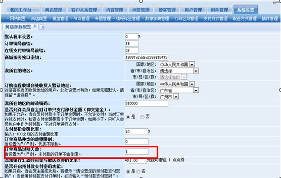 接下来,我们在商店参数配置的界面中可以看到“订单商品过期天数”设置选项。可以根据您的实际需求来设置订单提交多久未付款便自动关闭,在旁边的空格中填写相应的天数,当设置为“0”时,为付款的订单将不会作废。