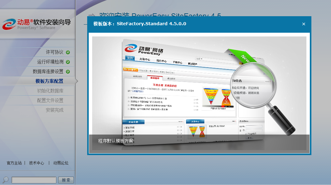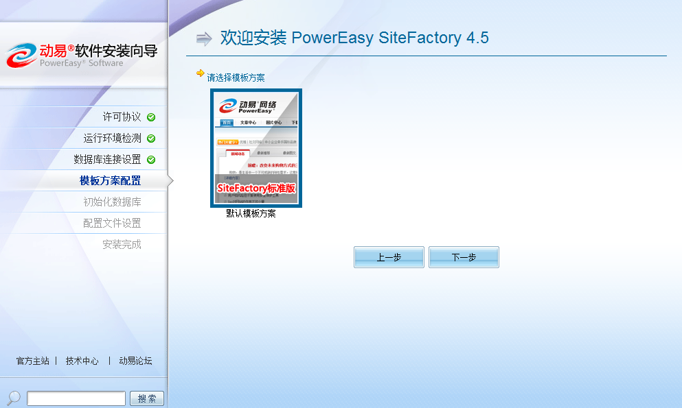 在产品安装过程中,我们可以看到增加了一步“选择模板方案”,页面中显示出待选的模板方案的首页效果缩略图。