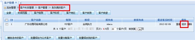首先,进入首先进入系统后台“客户关系管理”界面,在“我的客户”中点击“修改”功能按钮。