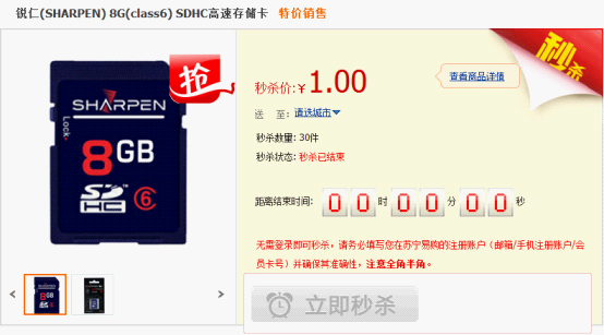 如下图是苏宁易购一元秒杀专区,30件超高性价比商品被瞬间秒杀: