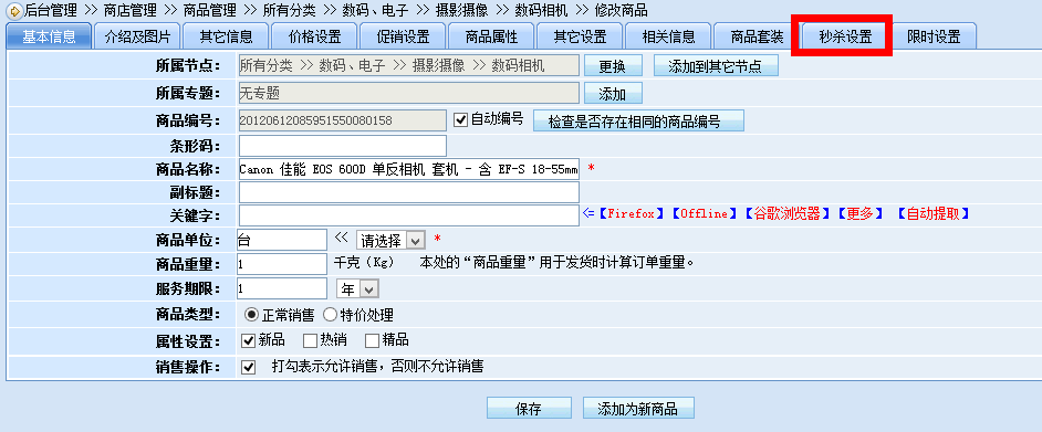 首先,进入动易BizIdea后台, 选择某件秒杀商品