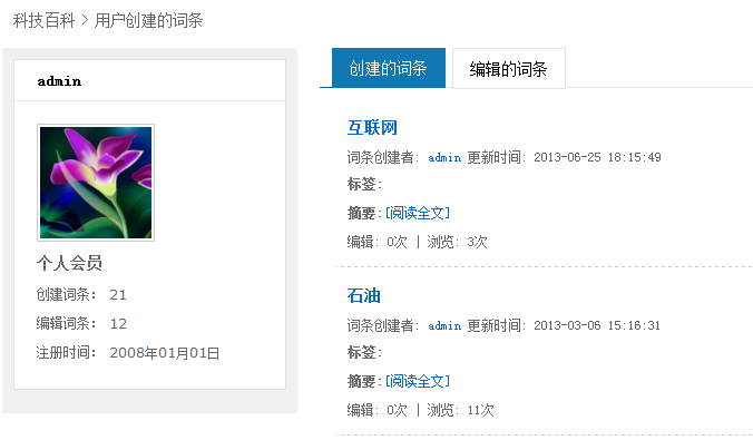 为了方便注册用户对自己创建的词条、编辑的词条等信息进行统一管理,系统设置了“用户创建的词条”页面,点击用户头像,即可进入“用户创建的词条”页面。注册用户可以在这里对自己的创建的或参与编辑的词条等进行查看词条。后台管理员设置权限后,用户还可以进行编辑词条、锁定词条、解锁词条、推荐词条、删除词条、设置词条分类等系列操作。