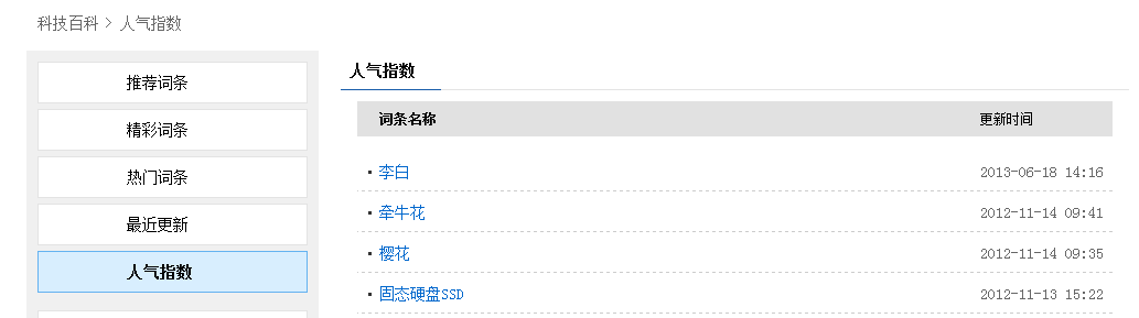 管理员可在后台置为推荐词条、精彩词条、热门词条等。前台会根据这些设置以及最近更新、人气指数等等进行排行。可以吸引更多的用户浏览。