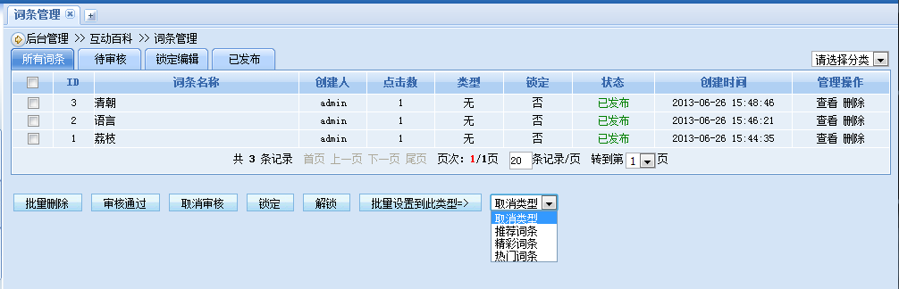 可以对词条进行管理,如审核\取消审核、锁定\解锁、设置词条类型(推荐词条、精彩词条、热门词条)等。