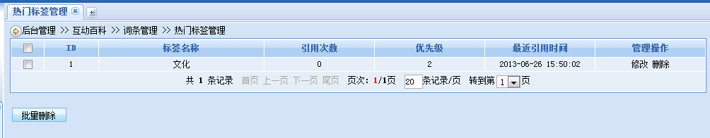 管理员可以添加热门标签,表示近期搜索或引用的热门标签,可用于前台首页或其他页引用、导航等。
