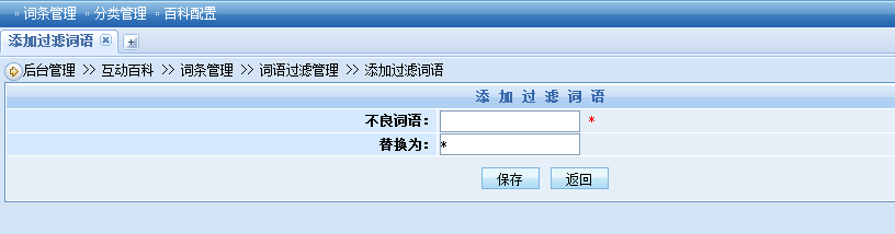 管理员可设置需要过滤的词语,此处添加的词条则视为“非法字符”,用户在添加词条时,会自动过滤掉“非法字符”,达到自动拦截“非法字符”的效果。