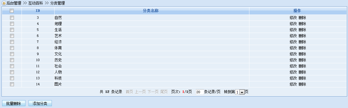 提供对词条分类管理功能,可对词条进行添加、修改、删除等操作。一个词条可以设置多个分类。前台用户创建词条时,会根据后台设置的词条分类为要创建的词条选择一个合适的分类。