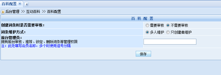 可以对百科配置进行设置.如创建词条是否需要审核;词条维护方式可以选择多人维护或只创建者维护;设置前台管理员,前台管理员拥有的权限:编辑词条、锁定词条、解锁词条、推荐词条、删除词条、设置词条分类等。