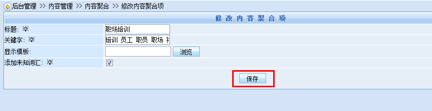 系统后台,点击“添加内容聚合项”,在出现在页面中,填写标题、关键字及选择模板。选择是否需要添加未知词汇到字典中。点击“保存”功能按钮,你所设置内容聚合即可显示在前台页面中。