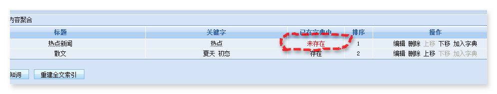 一些新产生的词汇或者特定名词不存在与字典中,则会在管理界面中显示。单击操作中的“加入字典”按钮即可将关键字加入到字典中。最后点击重建全文索引,并重新建立相关的全文索引即可。