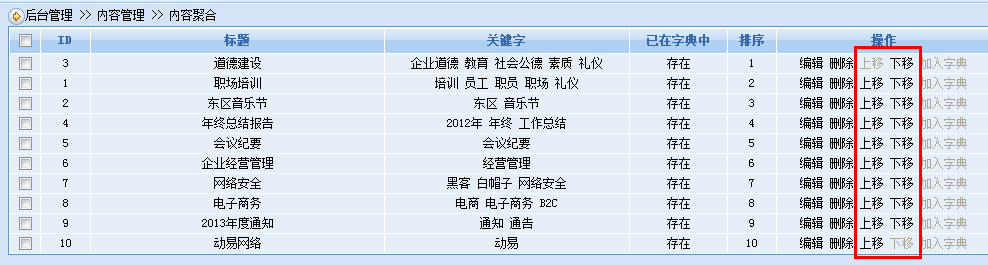 网站管理者可以随时按内容重要性调整内容的排序,在后台中通过操作区域中的上移下移按钮可以设置内容聚合的排序规则。调整后的排序,将同步在前台显示。