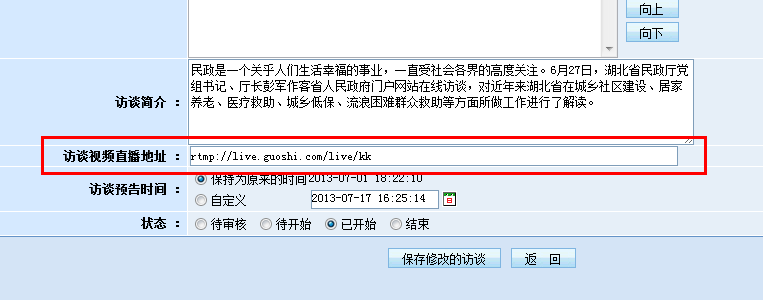 当需要创建新一期的在线访谈节目时,用户简单录入访谈主题、嘉宾、简介、访谈视频直播地址、开始时间、摘要、背景资料等信息后,便可快速创建起新的访谈节目。