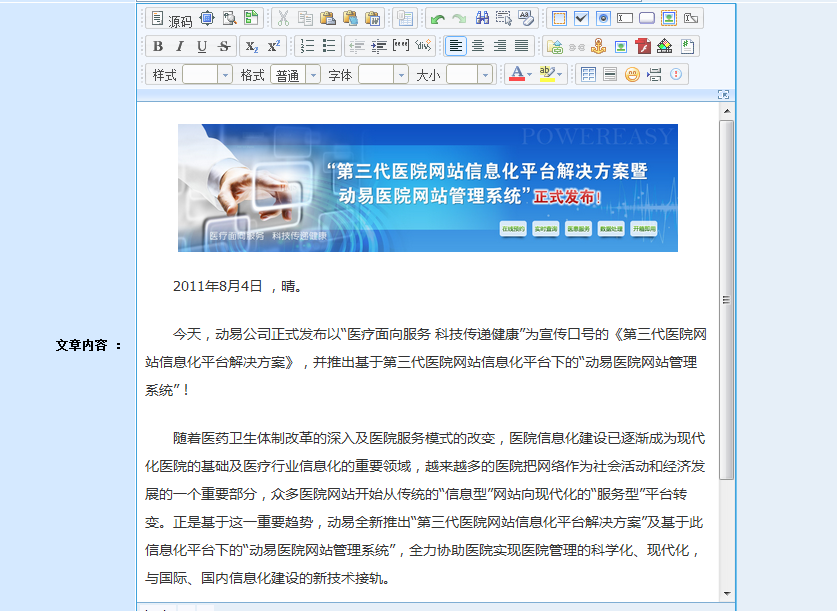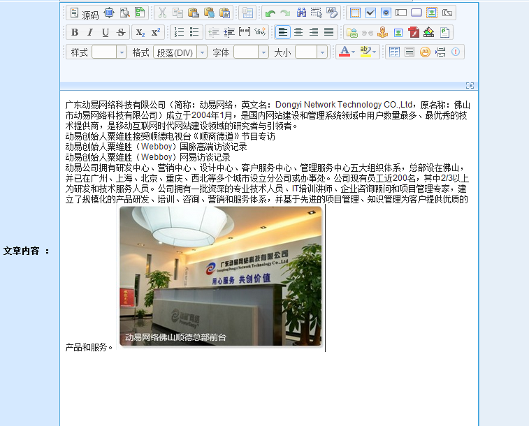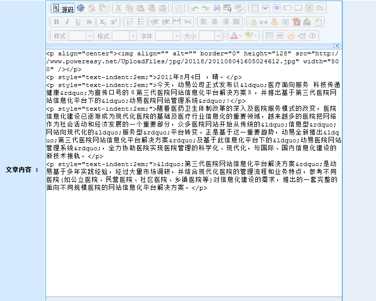 在动易后台,进入“添加文章页面”,在编辑器中输入文字,添加图片后,此时文章无格式: