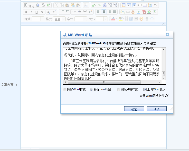 在动易后台,进入“添加文章页面”,在编辑器中从MS Word粘贴刚复制的文章: