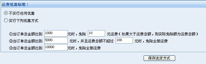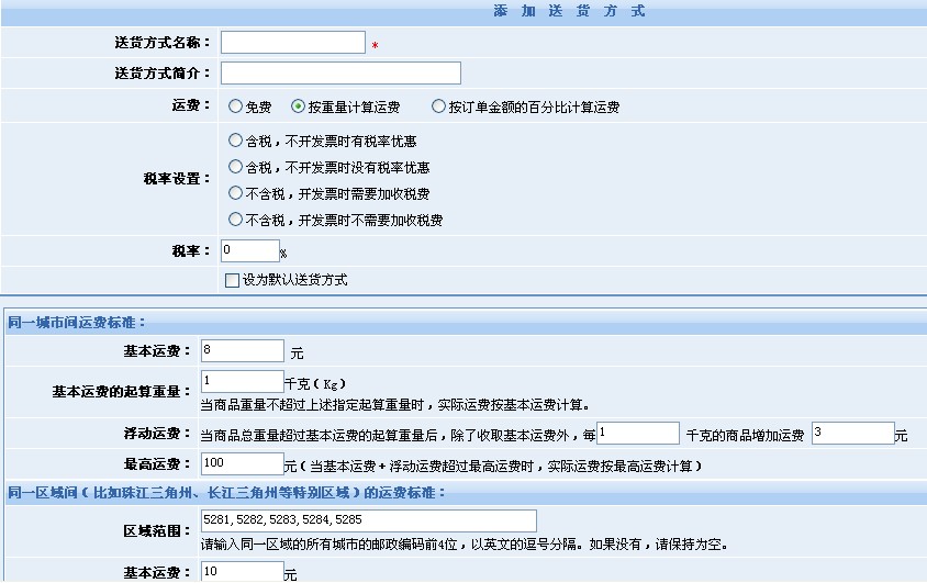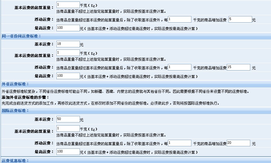按重量计算运费时,可以按同一城市间运费标准、同一区域间(比如珠江三角州、长江三角州等特别区域)的运费标准、同一省份间运费标准、外省运费标准和国际运费标准进行设置,每种运费计算方式均可设置基本运费、基本运费的起算重量、浮动运费和最高运费,同时也可设置运费优惠标准。