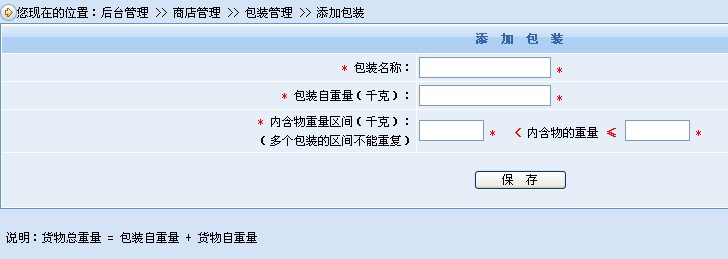 系统还提供了物流包装的功能,包装列表信息简单明了,支持自定义包装名称。下单时包装重量可计算在货物总重量中(货物总重量 = 包装自重量 + 货物自重量)。