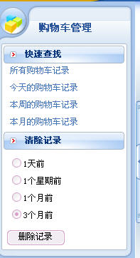 此外,还可以分别快速筛选出今天、本周和本月的购物车记录,如果购物车明细记录太多,影响了系统性能,或者是购物车记录已经不再需要了,还可以批量删除一定时间段(1天、1星期、1个月和3个月)前的记录。