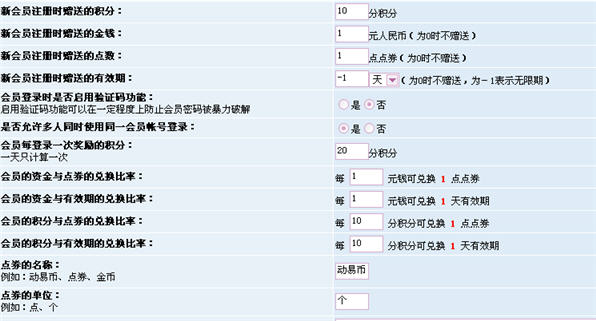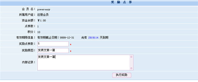 点券可以说是用于网站除购买商品外其他消费的一种虚拟资产,可以由管理员任意自定义点券的名称和单位,如可命名为“动易币”。点券也可以由管理员在会员注册时候赠送;可以用积分或者现金来进行兑换(见图1);可以由管理员奖励;(图3)