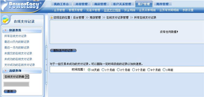 该功能可以让商家清楚地了解店铺发生的每一笔顾客购买商品进行在线支付的情况,当商家要进行顾客支付确认的时候,该功能允许商家根据支付时间、用户名或在线支付编号进行交易支付记录的快速检索。此外,动易eShop2007也内置了一些常用的条件查询功能菜单,如查询“所有的记录”、“最近10天的记录”、“最近一个月的记录”、“未提交的在线支付记录”、“未成功的在线支付记录”等,以方便商家快速了解网店顾客购买商品的支付情况,更高效地进行网店的收款管理。