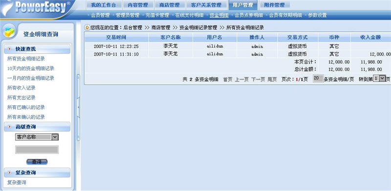 在网店中,在线的支付方式是最为普遍的支付方式,大多顾客都会选择和使用此种方式来支付,于是在动易eShop2007用户管理模块中单独设定了“在线支付明细”功能。
