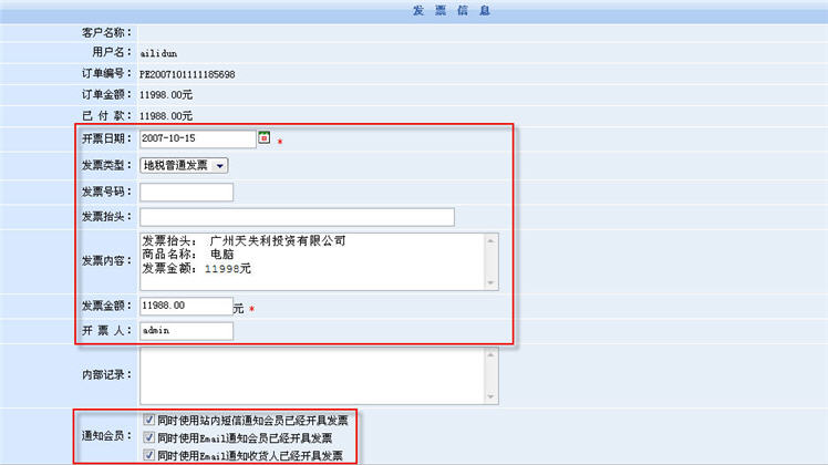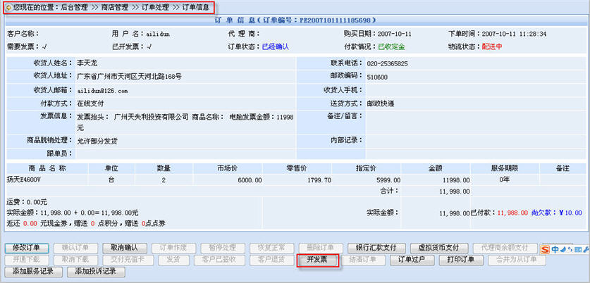 在动易eShop2007里,为顾客开发票是通过这个步骤进行的:后台管理——商店管理——订单处理——订单信息——开发票。