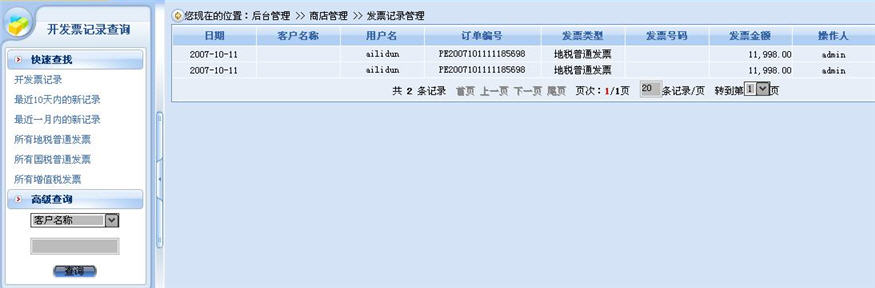 系统提供了快速查找功能,预置了一些常用查询。除了可以通过时间进行查询之外,还可以对开票的类型进行查询,另外,在高级查询功能中,商家可以指定“客户名称”、“开票人”选、“开票日期”,来进行查询,而不用从订单中来查看开票的信息,极大的提高财务发票管理的效率。